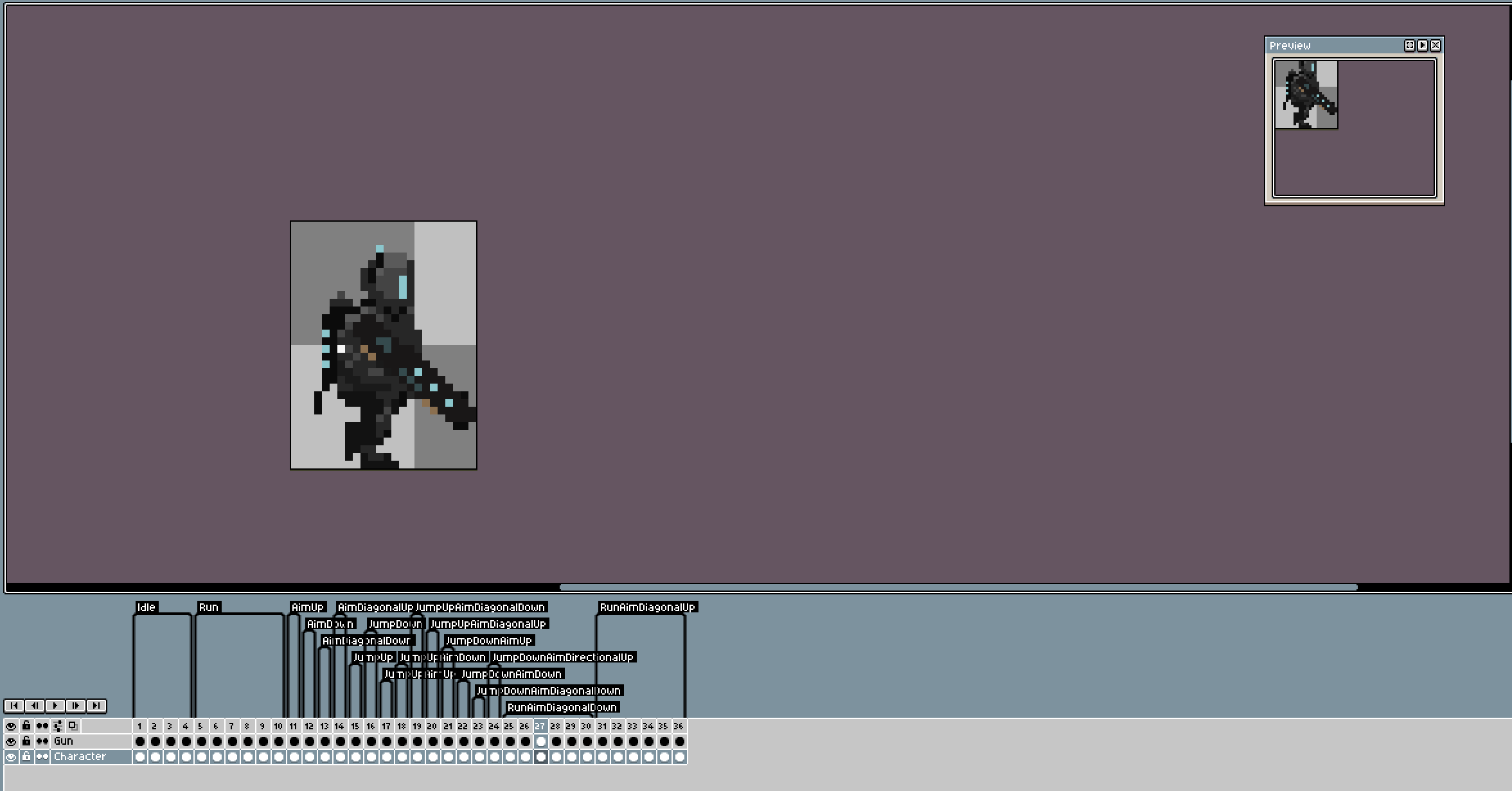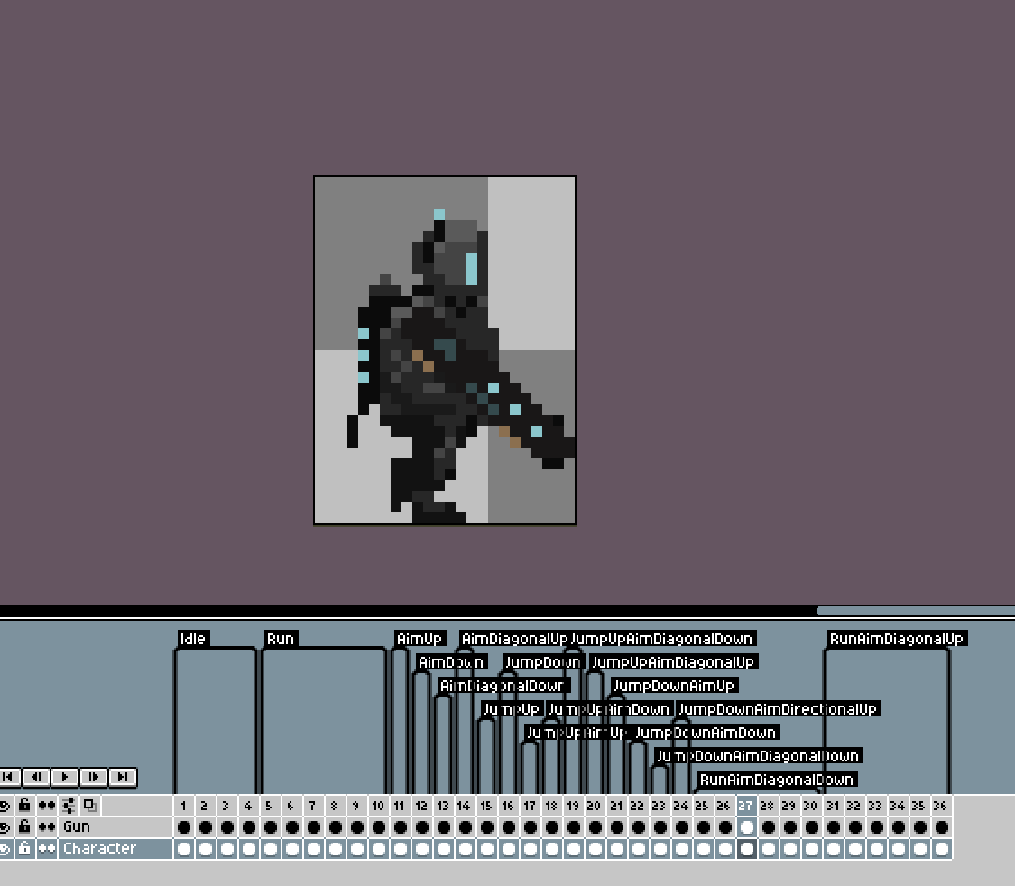 This package includes the full sprite sheets and complete Aseprite files with all animations set up and labelled, making it easy to use. There are animations for idle, running, aiming in all directions (up, down, diagonal up, and diagonal down), crouching, jumping, walking while aiming, and jumping while aiming.